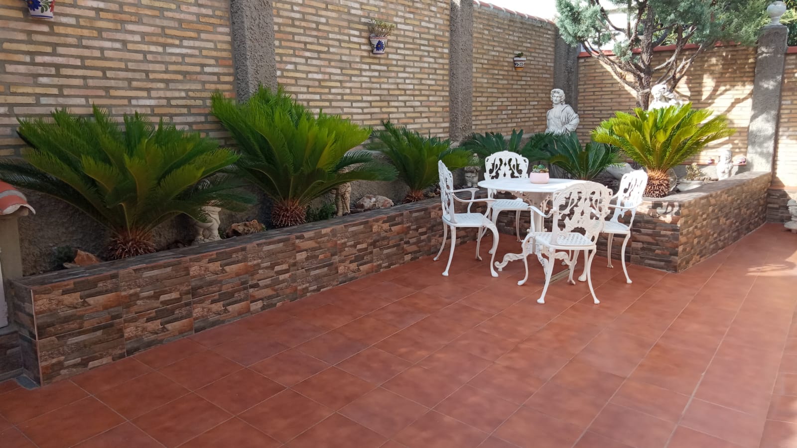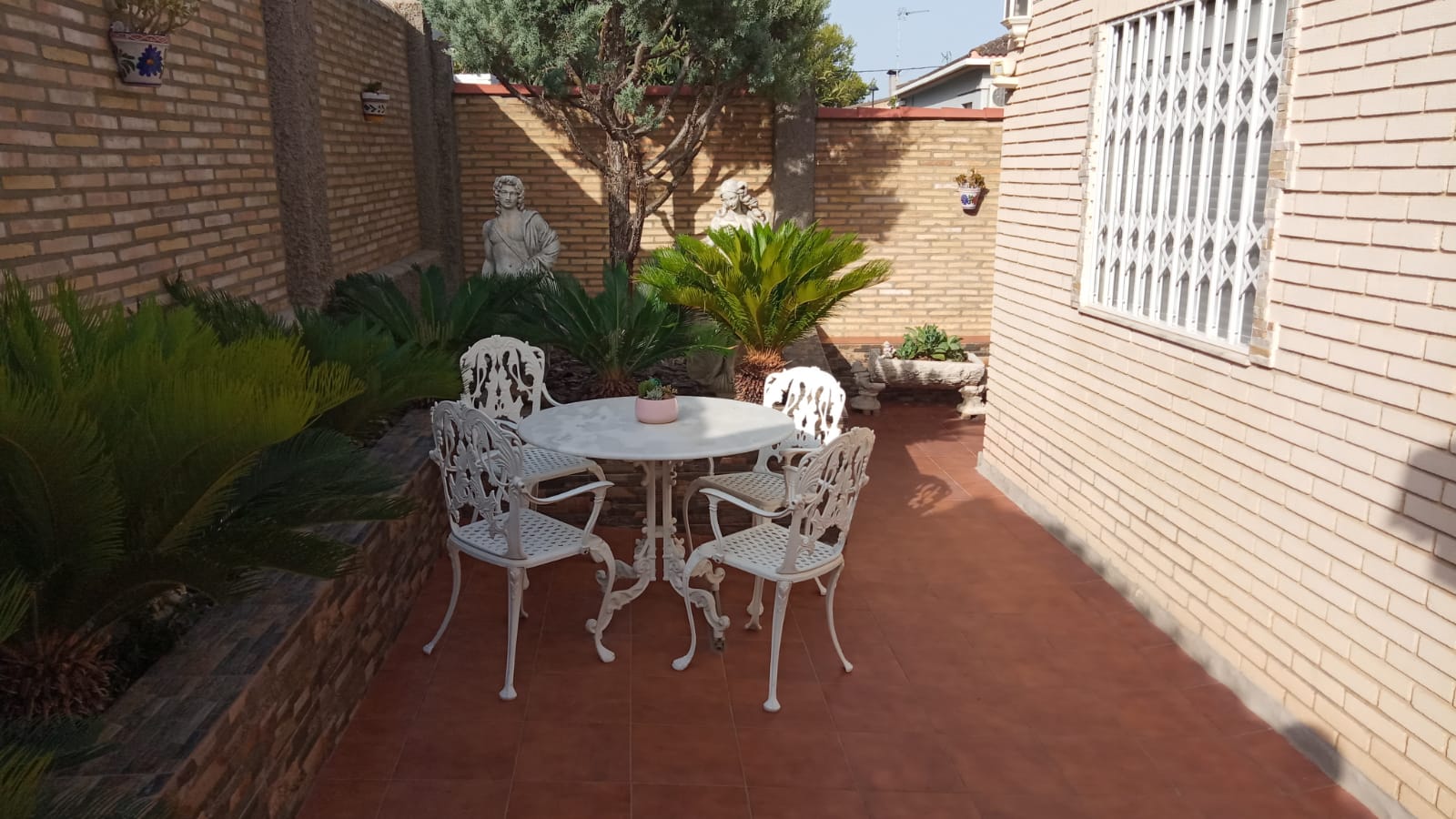 Uno de los mayores atractivos de este chalet en El Vedat es su amplio espacio exterior. Dispone de dos terrazas, una cubierta y otra abierta, perfectas para disfrutar del buen tiempo, organizar cenas o simplemente relajarse. El jardín privado rodea la propiedad, ofreciendo un entorno verde y sereno. Además, la piscina privada es ideal para refrescarse en los meses más calurosos.